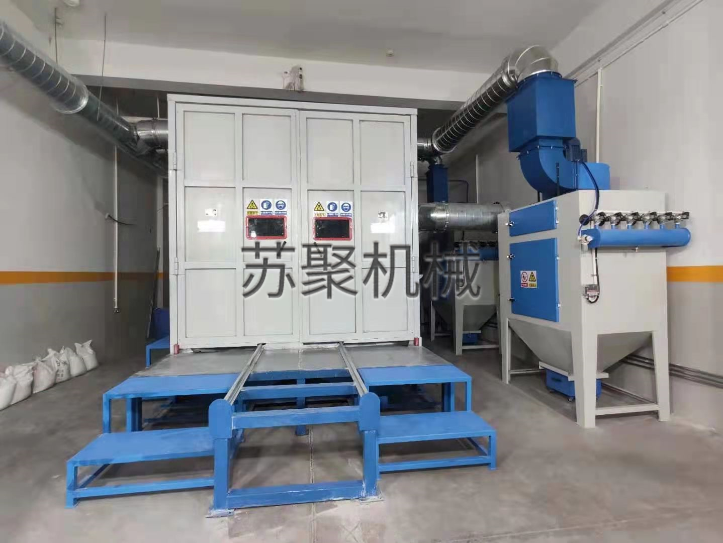 6.喷砂室体采用了上部进风,下部和侧部均可进行吸风的抑尘循环方式。粉尘始终向下引流,室内能见度高,员工操作环境好,同时保护了工人健康;